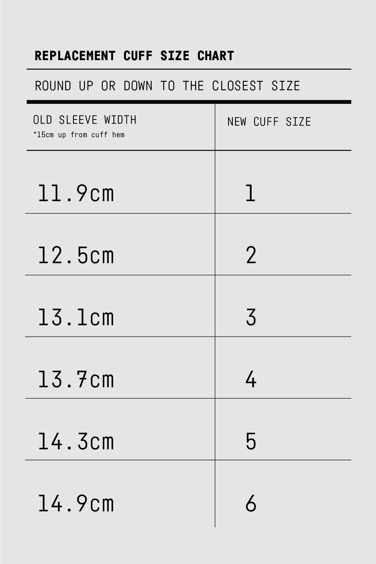 Follow the size chart in the product photos, taking your measurement 15cm up from the cuff hem (the very bottom of your cuff). If your measurement falls in between sizes, please round up.